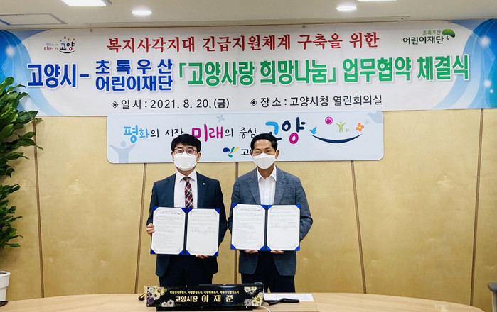 [부자동네타임즈 김인수기자] 고양시와 초록우산 어린이재단(경기북부지역본부)이 지난 20일 복지사각지대 긴급지원체계 구축을 위한 ‘고양사랑 희망나눔’ 사업을 위한 업무 협약(MOU)을 체결했다.