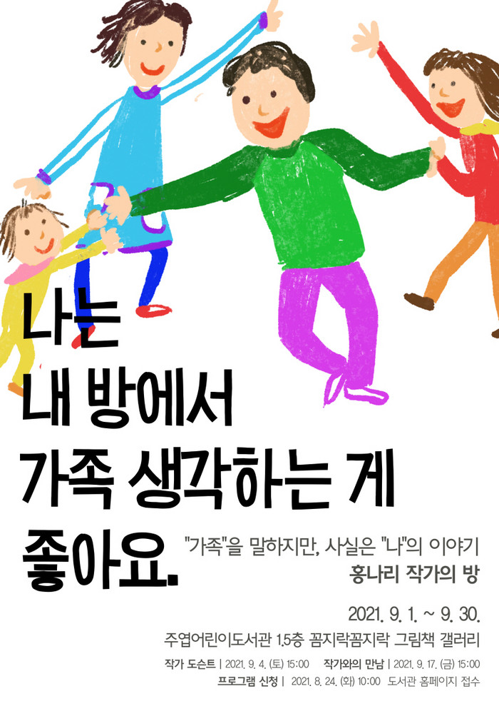 “나는 내 방에서 가족 생각하는 게 좋아요.”라는 주제로 열리는 이번 전시회는 홍나리 작가의 세 작품아빠, 미안해하지 마세요!, 어느 날, 우리는, 모험가의 자장가의 그림책 원화와 영상이 전시된다.