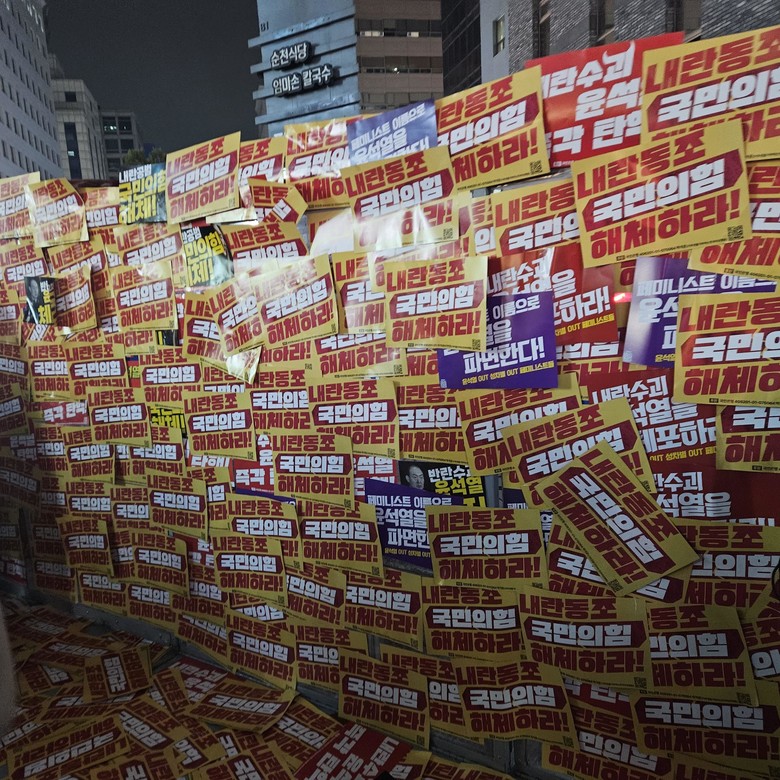 행진 후 윤 대통령 탄핵과 국민의힘 해체를 촉구하는 내용이 적힌 손피켓을 당사 앞에 설치된 경찰 방벽과 도로에 붙이는 퍼포먼스도 했다.