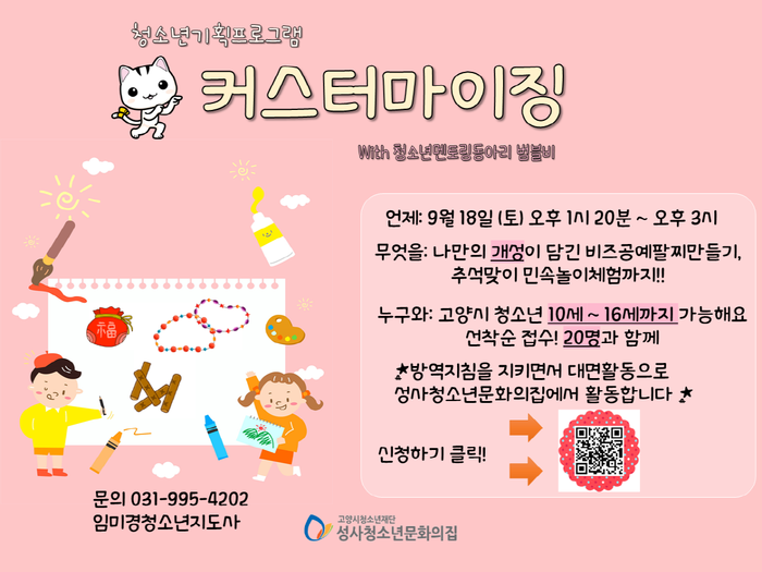 18일에 진행되는 이번 활동은 지역사회 청소년(10세~16세) 20명을 대상으로 ‘커스터마이징’이라는 테마를 가지고 코로나19 장기화로 위축되고 있는 추석 명절의 의미를 되새기고자 윷놀이, 전통 공기놀이를 조별로 체험하고, 자신만의 개성을 나타낼 수 있는 비즈공예 체험으로 진행된다.