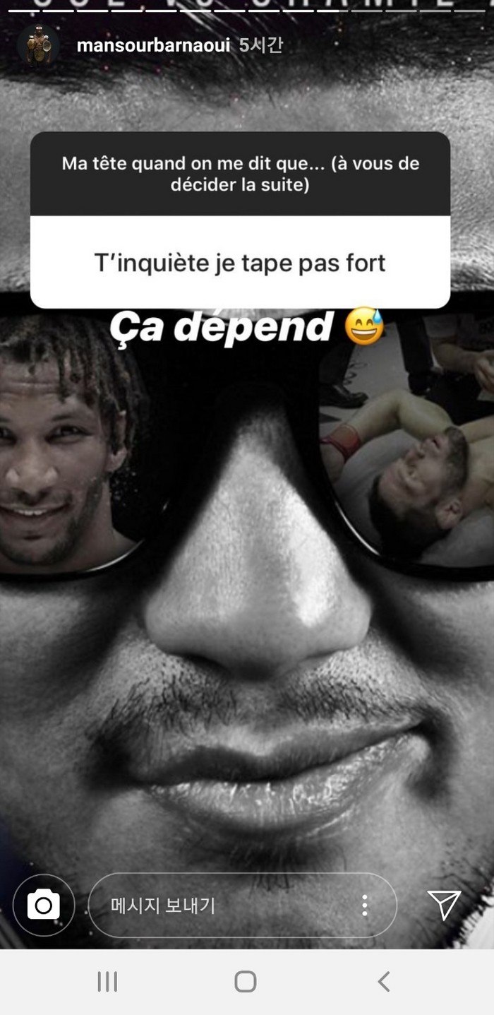 여기에 만수르 바르나위는 게시물을 하나 더 올렸다. 지난 5월 100만불 토너먼트 최종전으로 치러진 권아솔과의 경기 사진이다. “케이지 바닥에서 목을 졸라 끝냈다”는 말도 덧붙였다.