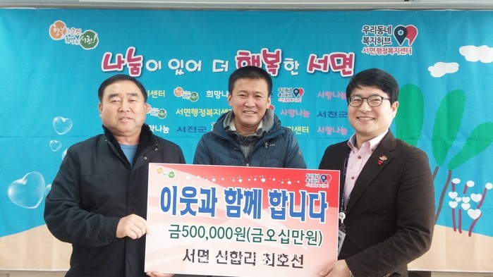 [부자동네타임즈 이현석 기자]서면 신합리에 거주하는 최호선(남, 46세)씨는 26일 이웃돕기성금 50만원을 서면지역사회보장협의체와 서면사랑후원회에 기탁했다.