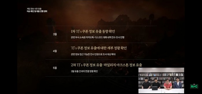 본유출을 담당했던 이상민 운영실는 "지난 3월경에 TJ쿠폰 유출을 최초로 확인했고 회사 내부뿐만 아니라 외부 용역 또한 조사했다. 그러든중 유출자에 법위를 좁힐 수 있었다. 허나 어느 정도 실마리가 잡혀 지금 말씀드리지만 너무 느져서 죄송하다. 하지만 사법권이 없어는게 아니기 때문에 조사에 어려움이 있었다."라고 전했다.