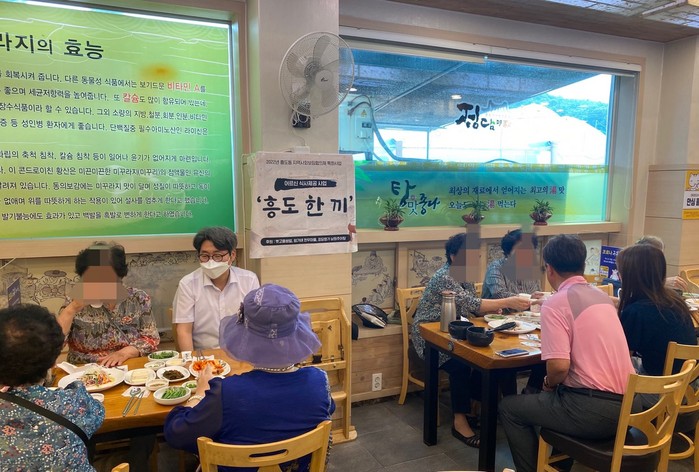 ‘흥도 한 끼’는 흥도동 지역사회보장협의체 특화사업의 일환으로 85세 이상 독거어르신 76분을 격주에 한 번씩 식당에 모시고 건강을 기원하며 다 함께 식사를 진행하는 사업이다.