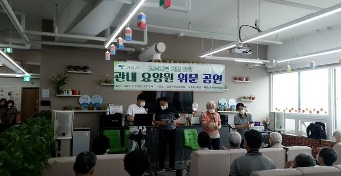 이날 위문공연은 2022년 화정1동 주민자치 사업‘문화가 숨 쉬는 희망화정사업’의 일환으로 그동안 코로나19와 무더위로 몸과 마음이 지쳐있을 요양시설 종사자 및 입소자들에게 위로를 전하기 위해 화정1동 주민자치회가 기획했다.