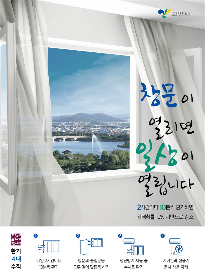 이를 위해 고양시는 ‘고양형 환기 기본 가이드라인(십계명)’을 마련하고, 포스터·대중교통 안내방송·시청 통화연결음 등을 통해 시민들에게 적극 홍보할 계획이다.