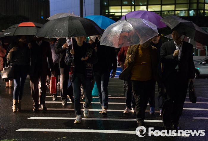 (서울=포커스뉴스) 전국적으로 반가운 가을비가 내리기 시작한 6일 오후 서울 종로구 종각역 인근에서 우산을 쓴 시민들이 발걸음을 재촉하고 있다.