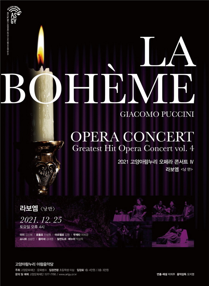 [부자동네타임즈 김인수기자] 고양문화재단(대표이사 정재왈)은 2021 아람누리 오페라 콘서트 시리즈의 네 번째 무대로 라보엠을 12월 25일(토) 오후 4시, 고양아람누리 아람음악당에서 선보인다. 문화뱅크와 연중 총 4회 공동 기획으로, 오페라를 콘서트 형식으로 즐기는 ‘오페라 콘체르탄테’로 제작한다. 공연은 피아노 반주로 진행되나, 무대 배경막과 주요 대·소도구 등으로 관객들에게 정통 오페라 본연의 감동을 전달한다.