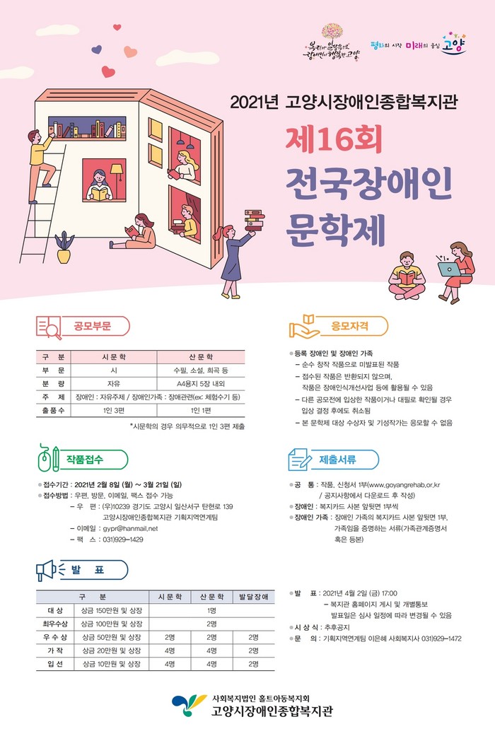 [부자동네타임즈 김인수기자] 고양시가 2021년 제16회 전국장애인문학제의 출품작 접수를 오는 8일(월)부터 3월 21일(일)까지 받는다.