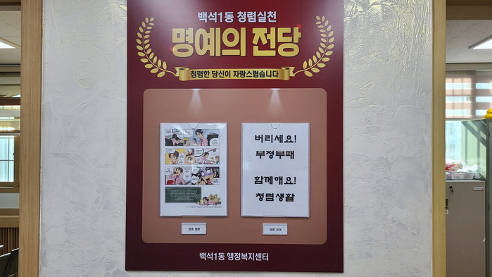 [부자동네타임즈 김인수기자] 고양특례시 백석1동 행정복지센터는 청렴 문화 정착을 위한 마음을 담아 사무실 내에‘백석1동 청렴실천 명예의 전당’을 설치했다고 15일 밝혔다.