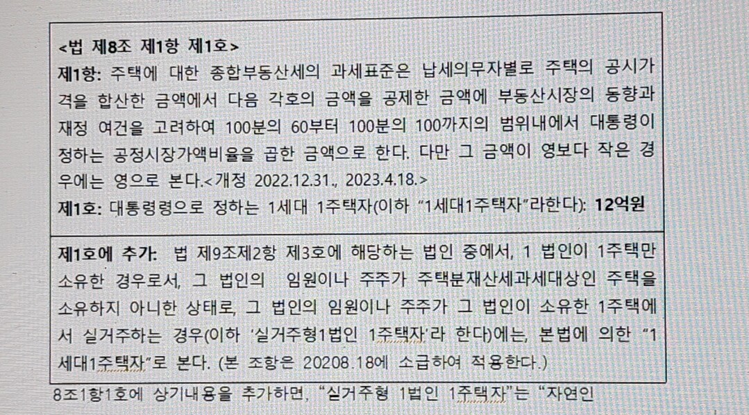 그러나 “실거주형 1법인 1주택자”의 경우는, 법인의 주택투기와는 무관하고, 자연인 소유 1세대1주택과 그 실질에 있어서는 동일하다는 점은 이미 자세히 살펴보았다.