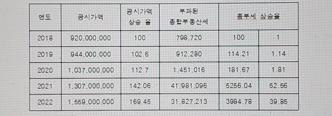 종부세법 개정 전후에 상기 법인의 1주택에 부과된 종부세액을 비교해보면. 2020년까지는 자연인 1세대 1주택으로 간주하여 종부세를 부과하다가 2021년부터는 법인소유 1주택에 대한 단일세율 3%를 적용하여 직전년도에 비하여 30-40배가량 폭등하였음을 알 수 있다. 이같이 갑작스러운 세부담의 증가가 여기에 해당되는 가족의 생계와 안위를 위협하고 벼랑 끝으로 몰고 있음은 말할 필요도 없다.