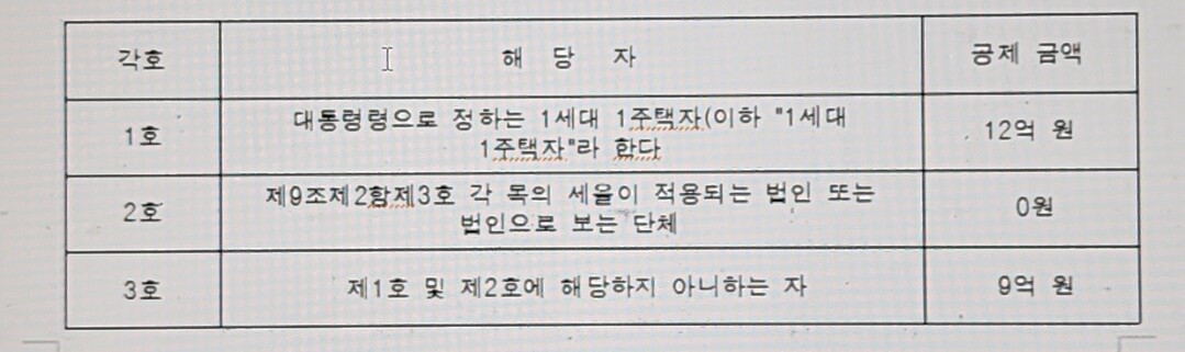 제1항 제 1호에서는 “대통령령으로 정하는 1세대 1주택자”는 12억원을 공제하도록 정하고 있는데, 제2호에서는 법인의 경우는 공제액을 0 원으로 하고 있다.