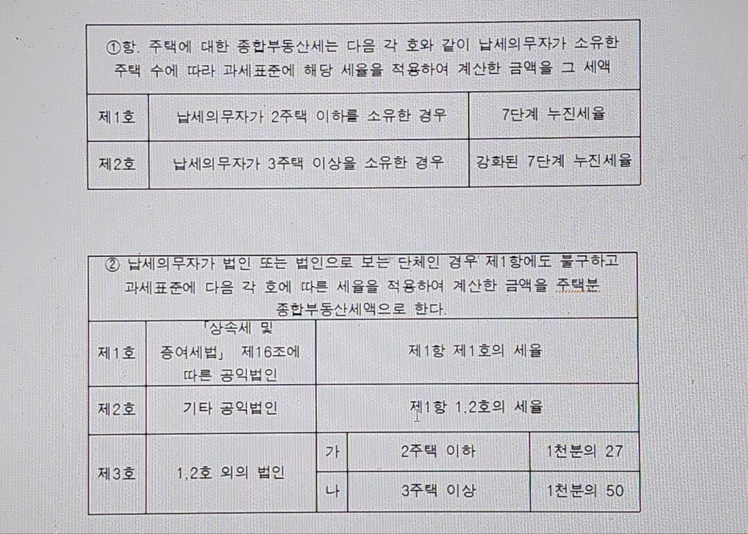 다음은 제9조( 세율 및 세액) 이다. 종부세의 세율은 자연인과 법인을 크게 구분하고, 자연인은 2주택 이하를 동일하게 취급하고, 3주택 이상을 동일하게 취급한다.