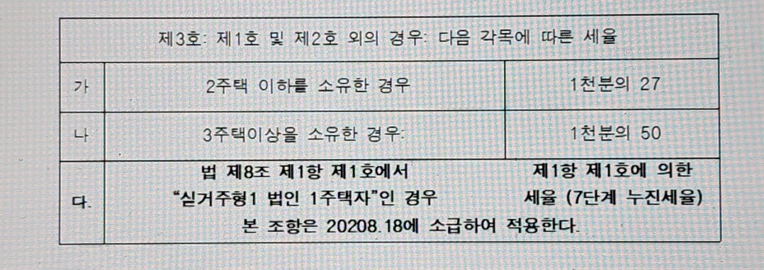 문제가 되는 본건 “실거주형 1법인 1주택자”는 그 예외조항 9조2항의 1,2호)에 해당하지 않기 때문에 9조2항 3호의 <가=1천분의 27>의 세율을 적용받게 된다. 제8조에서 과세표준 계산에서 “실거주형 1법인1주택자”를 “자연인 소유 1세대 1 주택자”와 동일한 기준을 적용하도록 하였다면, 제9조 세율을 적용할 때에도 자연인 1세대1주택자와 동일한 기준을 적용받도록 하여야 할 것이다.