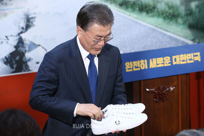 9일 오후 서울 광진구 광나루 서울시민안전체험관에서 정책공간 국민성장의 주최로 열린 대한민국 바로 세우기 제6차 포럼 '안전한 나라가 잘 사는 나라'에서 문재인 더불어민주당 전 대표가 작년 서교동 화재로 숨진 초인종 의인 고(故) 안치범 씨의 부모님이 선물한 운동화를 든 채 기조연설 후 자리로 이동하고 있다. 2017.02.09.