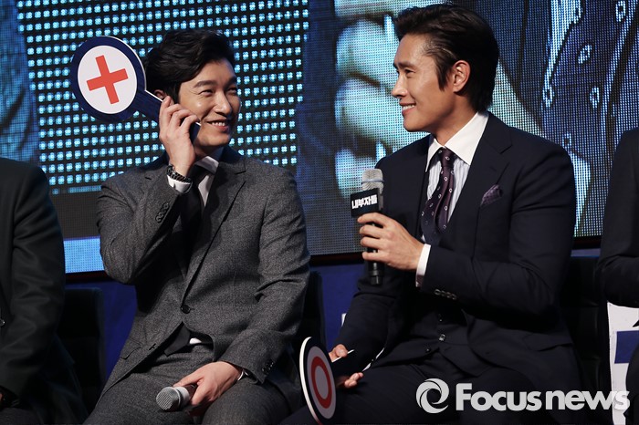 (서울=포커스뉴스) 4일 오후 서울 송파구 롯데시네마 월드타워점에서 열린 영화 '내부자들' 흥행 쇼케이스 오픈 TALK 행사에 참석한 배우 조승우(왼쪽)와 이병헌이 마주보며 미소를 짓고 있다.