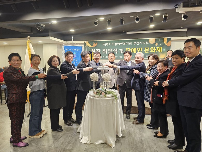 | ▲‘경기도장애인복지회 부천시지부 제2대 김기호 회장 취임식’에서 케이크 커팅식을 진행하고 있다 |