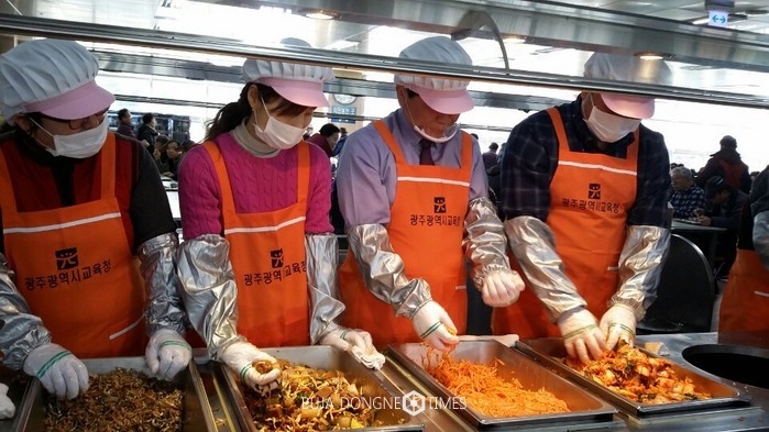 광주광역시서부교육지원청 김광현 교육장과 직원 20여 명이 6일 빛고을노인건강타운을 방문해 급식 배식과 식당 환경정리 등 급식 봉사활동을 실시했다.