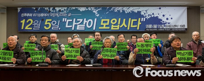 (서울=포커스뉴스) 4일 오전 서울 중구 프레스센터 기자회견장에서 민중총궐기투쟁본부, 시민사회단체연대회의, 백남기 농민 대책위 관계자들이 오는 5일 개최 예정인 '범국민대회' 국민 참여를 촉구하는 기자회견을 하고 있다.