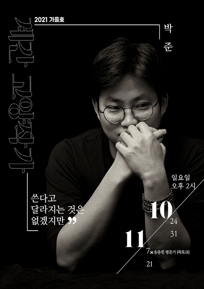 박준 시인을 직접 만날 수 있는 자리도 마련되어 있다. 10월 24일(일), 31일(일), 11월 21일(일)에는 강연이, 11월 7일(일)에는 송종원 평론가와의 북토크가 도서관 지하 북카페에서 열린다.