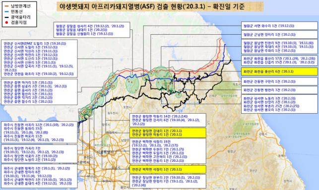 국립환경과학원은 3월 1일 폐사체 9개체에서 아프리카돼지열병 바이러스를 확진하고 결과를 관계기관에 통보했다. 이로써 화천군 113건, 연천군 87건, 파주시 68건, 철원군 22건, 총 290건의 멧돼지 아프리카돼지열병이 확진됐다.