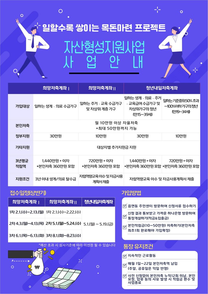자산형성지원 통장사업은 근로소득이 있는 수급자와 차상위계층 대상자가 자립에 필요한 자산을 형성할 수 있도록, 가입기간 3년 동안 본인 저축액에 근로소득장려금을 더해 적립함으로써 목돈을 마련하는 사업이다.