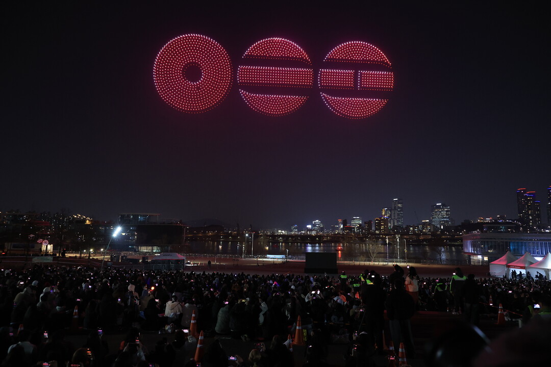 [부자동네타임즈 = 이병도 기자] 방탄소년단(BTS)의 완전체 컴백 공연을 하루 앞둔 20일 밤 서울 뚝섬한강공원에서 관련 드론쇼가 펼쳐지고 있다. 2026.3.20