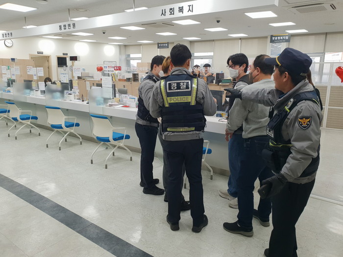 이날 훈련은 △폭언 발생 시 상급자의 적극 개입과 중재 시도 △사전고지 후 녹음 및 촬영 △비상벨 작동여부 확인 △담당공무원 보호 및 민원인 대피 △가해민원인 제압 △경찰 인계 등의 순으로 실제 발생할 수 있는 상황을 적용하여 동 행정복지센터 공무원과 경찰의 현장대응능력을 향상하였다.