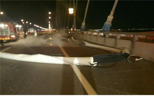 | △ 3일 오후 6시 12분쯤 경기 평택시 서해대교 목포방면 행담도 휴게소 전방 주탑에 불이 나 연결된 케이블이 끊어져 다리위에 떨어져 있다. <사진제공=경기도재난안전본부> |