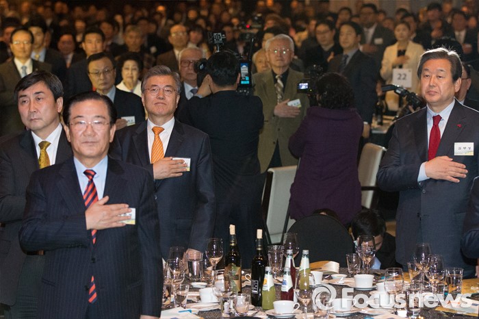| △ 10일 오후 서울 영등포구 63빌딩에서 김대중평화센터 주최로 열린 '고 김대중 대통령 노벨평화상 수상 15주년 기념식'에 김무성(오른쪽) 새누리당 대표와 문재인(왼쪽 세번째) 새정치민주연합 대표, 이종걸(왼쪽) 새정치민주연합 원내대표 등 정치인들이 국기에 대한 경례를 하고 있다. <사진제공=포커스뉴스> |