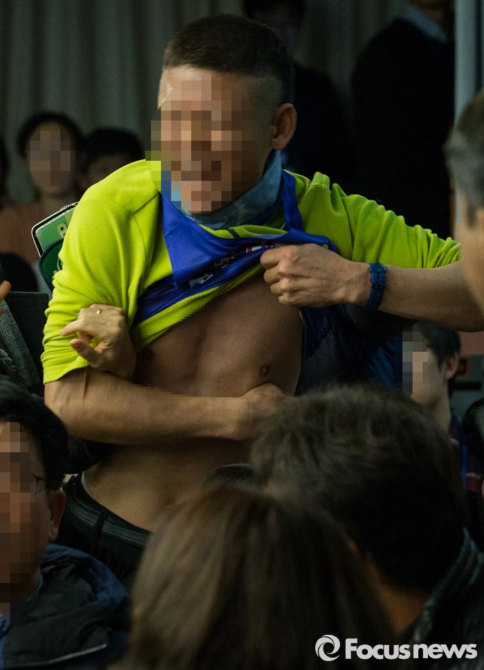 | △ 14일 오후 서울 중구 서울YWCA에서 열린 '4·16세월호참사 특별조사위원회 제1차 청문회'에 참가한 세월호 생존자 김동수 씨가 날카로운 물체를 이용해 자해를 하고 있다. <사진제공=포커스뉴스> |