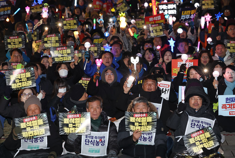 쌀쌀한 날씨에 눈까지 내린 18일에도 서울 도심에선 윤석열 대통령 탄핵 찬반 집회가 밤낮으로 이어졌다.윤석열 즉각퇴진·사회대개혁 비상행동 등 탄핵 찬성 단체들은 오후 7시 경복궁 동십자각 앞에서 집회를 열었다. 지난 9일부터 열흘 연속이다.