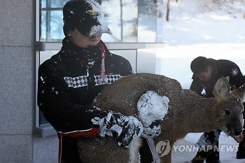 11일 18일 오후 석촌호수 인근 주상복합아파트 단지촌에 야생 고라니가 나타나 주택가와 차도를 헤매다 소방대원들에게 포획된 것.
