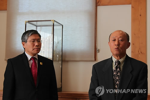 | △ 광복군 비행사 장병훈 건국훈장 전달받은 외손자 심정윤씨 (샌프란시스코=연합뉴스) 임화섭 특파원 = 일제강점기에 광복군 비행학교 교관을 지낸 애국지사 고(故) 장병훈(1894∼1979)씨의 외손자 심정윤(사진 오른쪽)씨가 1월 30일(현지시간) 한동만(사진 왼쪽) 주(駐)샌프란시스코 총영사로부터 외할아버지의 건국훈장 애족장을 전달받고 나서 소감을 밝히고 있다. 2015.2.1 solatido@yna.co.kr |