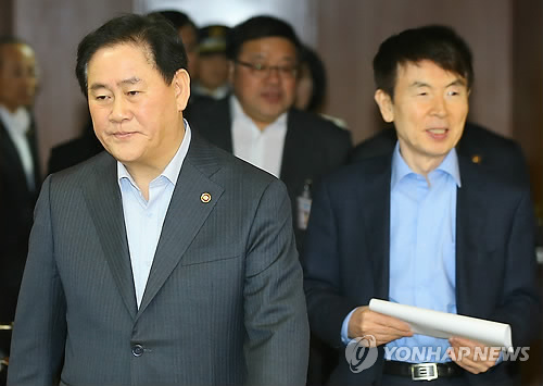 | △ 회의장 입장하는 장관들과 청와대 수석들 (서울=연합뉴스) 황광모 기자 = 최경환 경제부총리 겸 기획재정부 장관과 현정택 청와대 정책조정 수석(오른쪽)이 1일 오전 서울 세종로 정부서울청사에서 열린 정책조정강화를 위한 정부-청와대 관련 회의에 입장하고 있다. |