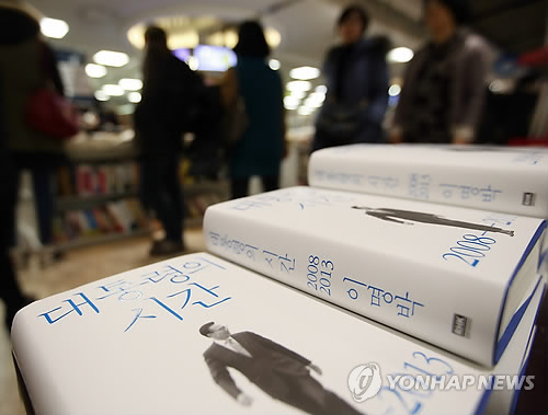 | △ 서점에 나온 MB 회고록 '대통령의 시간' (서울=연합뉴스) 한종찬 기자 = 31일 오후 서울 광화문 교보문고 판매대에 이명박 전 대통령의 회고록 '대통령의 시간'이 놓여 있다. 이 회고록에는 이 전 대통령의 재임 시절 세종시 수정안 부결 사태와 남북관계 비사 등이 담겨 있다. 2015.1.31 saba@yna.co.kr |