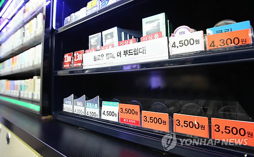 | △ (서울=연합뉴스) 신호경 기자 = 담뱃값 인상의 충격과 이 기회를 틈 타 상대적으로 가격을 낮춘 외국산의 공세에 밀려 국산 KT&G의 점유율이 40% 안팎 수준까지 떨어졌다. 국산 담배 판매 규모가 외국산에 뒤진 것은 지난 1986년 필립모리스 '말보로'가 외국산 담배로서 국내에 첫 상륙한 이후 29년만에 처음이다. 사진은 편의점 진열대의 외산 담배들. |