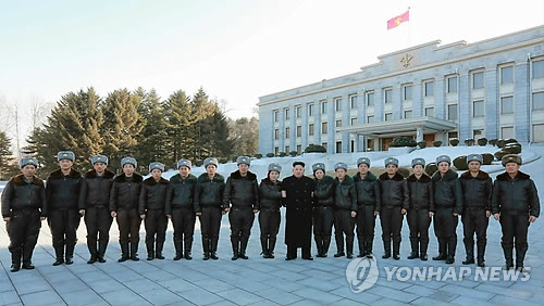 | △ 북한 김정은, 전투비행사들과 기념사진 (서울=연합뉴스) 북한 김정은 국방위원회 제1위원장이 올해 첫 비행훈련으로 표창 휴가를 받은 전투비행사들을 만나 격려했다고 노동당 기관지 노동신문이 2일 밝혔다. 김 제1위원장은 포창휴가를 받은 17명의 전투비행사를 노동당 중앙위원회 청사로 불러 기념사진을 찍고 강도높은 훈련을 주문했다. 2015.2.2 nkphoto@yna.co.kr |
