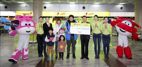 진에어는 이날 오전 김포공항 국내선 청사의 진에어 체크인 카운터 앞에서 국내선 1천만 번째 승객인 강선미(32)씨 가족에게 김포∼제주 노선 무료 왕복항공권 2매를 전달하는 기념행사를 열었다.