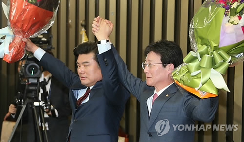 | △ (서울=연합뉴스) 백승렬 기자 = 새누리당 새 원내대표로 선출된 유승민 의원과 정책위의장 러닝메이트 원유철 의원이 2일 국회에서 열린 의원총회에서 꽃다발을 들어 의원들에게 답례하고 있다. |