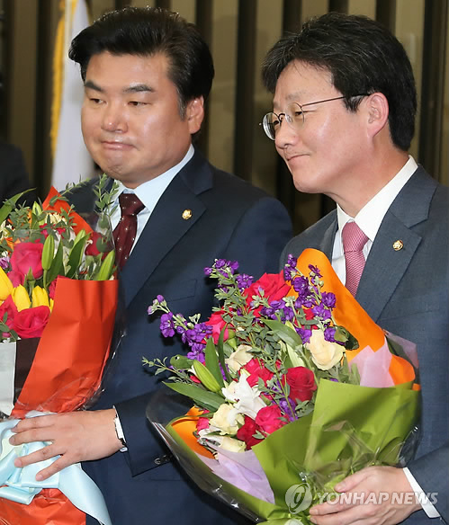 | △ 유승민 새누리 새 원내대표 (서울=연합뉴스) 백승렬 기자 = 새누리당 새 원내대표로 선출된 유승민 의원과 정책위의장 러닝메이트 원유철 의원이 2일 국회에서 열린 의원총회에서 꽃다발을 들고 있다. |