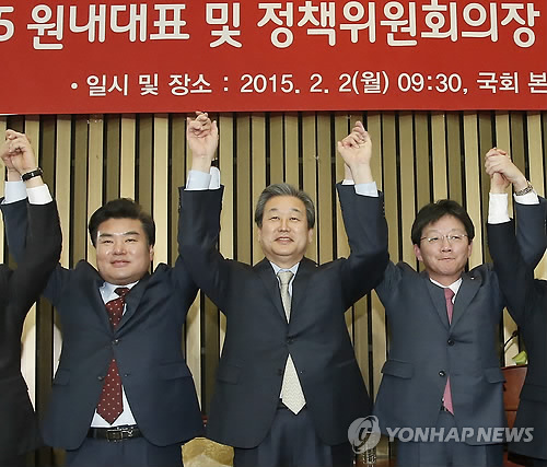 | △ 새누리당 원내대표 및 정책위의장 선출 의원총회 (서울=연합뉴스)이상학 기자 = 새누리당 김무성 대표가 2일 국회에서 열린 의원총회에서 원내대표,정책위의장으로 각각 선출된 유승민 의원과 원유철(맨 왼쪽) 의원 등과 함께 손을 잡고 인사를 하고 있다. |