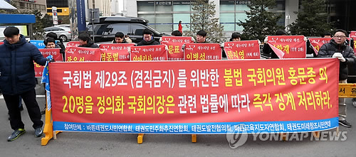 이들 단체는 "사직권고를 받은 김 의원과 홍 의원은 무보수 명예직이라는 궤변으로 일관하며 자리에 연연하고 있다"면서 "이들 의원과 함께 아직도 자리를 지키고 있는 국회의원들은 입법부 의원인 자신들이 개정한 국회법을 무력화시키는 후안무치한 작태를 보이고 있다"고 비난했다.