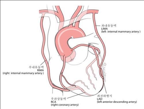 | △ 양측 내유동맥을 사용해 관상동맥 우회술을 시행한 모식도. |