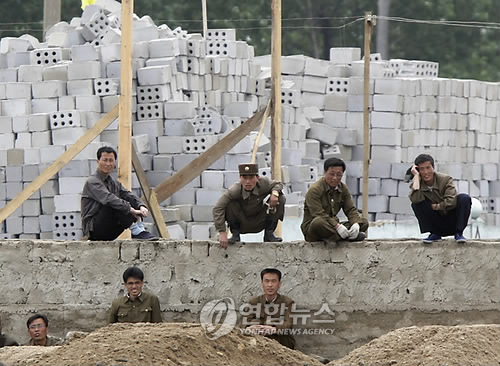 | △ 신의주 건설현장의 북한 노동자들 (AP=연합뉴스) 29일 중국 북동부 랴오닝성(遼寧省) 단둥(丹東)시 인근 압록강변에서 건너편의 북한 신의주 강둑 건설현장에서 쉬고 있는 북한 노동자들의 모습이 포착됐다. North Korean men rest at a construction site on the river banks of Sinuiju in North Korea as seen from along the Yalu river near Dandong in northeastern China's Liaoning province on Saturday, May 29, 2010. Top South Korean military commanders in Seoul discuss how to counter North Korean provocations as the leaders of South Korea, China and Japan head to the South Korean southern island of Jeju for a summit expected to focus on the sinking of a warship blamed on North Korea. (AP Photo/Ng Han Guan) |