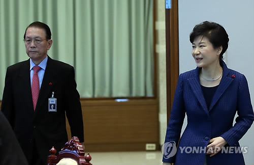 | △ 박근혜 대통령과 김기춘 비서실장이 지난달 26일 청와대 위민관에서 열린 수석비서관회의에 입장하고 있다. |