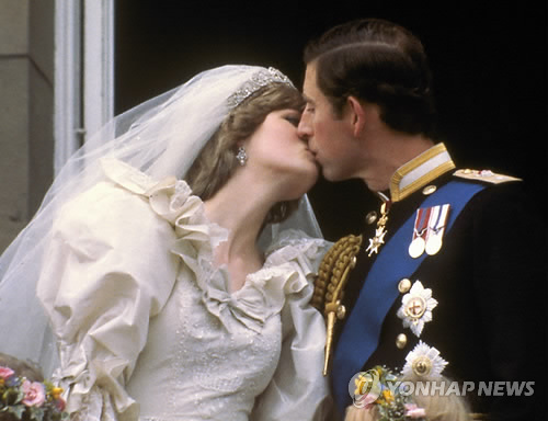 | △ 영국의 찰스 왕세자가 다이애나비와 결혼식후 버킹엄 궁 발코니에서 키스하고 있다.(AP=연합뉴스 자료사진) |