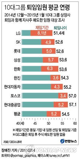 (서울=연합뉴스) 정주호 기자 = 삼성그룹, 현대차그룹 등 국내 10대 그룹에서는 임원을 5년여 지낸 뒤 55세가 안 되는 나이에 퇴임하는 것으로 조사됐다.