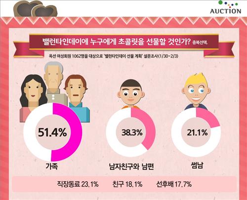 오픈마켓 옥션은 지난달 30일부터 이달 3일까지 여성회원 1천62명을 조사한 결과 응답자의 74.5%가 밸런타인데이에 초콜릿 선물을 할 계획이라고 답했다고 4일 밝혔다.
